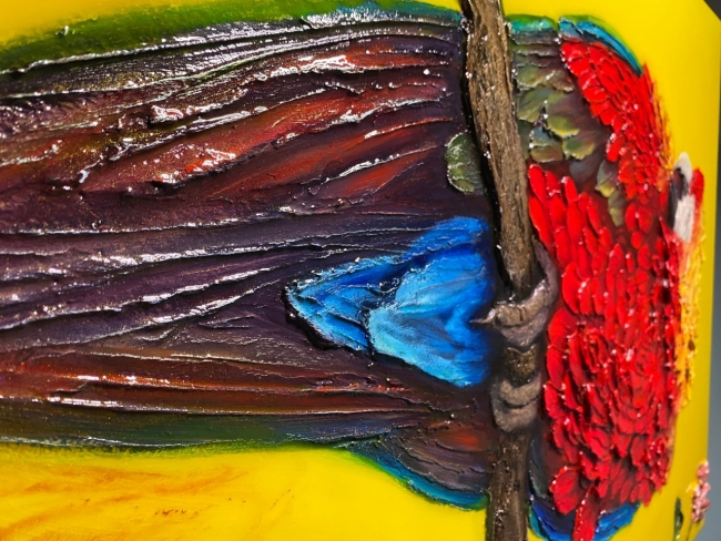 Картина очень яркая, сочная. На ней я изобразила яркого попугая Ара, картина очень объёмная, фактурная. Весит такая картина около 5 кг.