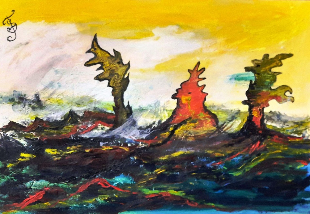 Первая. вид со спины. Старый седой человек раскинув руки стоит на вершине горы. Волосы его развиваются, он медленно рассыпается в прах. вторая. начало прошлого века. Несколько ...