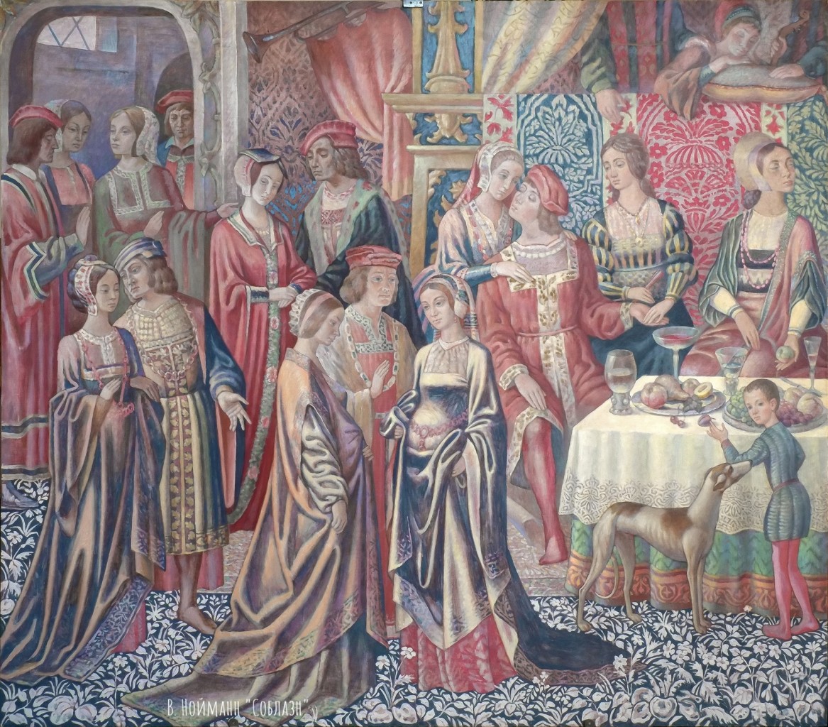 «Соблазн». Триптих эмблема сословий . Холст/ масло, 150х170 , 2023 г . Картина была представлена на выставке «Новое Средневековье в Государственном музеи истории Санкт-Петербурга.