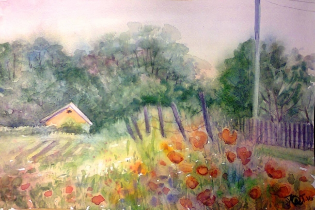 Начала писать сельский пейзаж с натуры летним вечером. Каждый раз хожу мимо и любуюсь маками у дороги. Как оказалось. я расположилась ногой в муравейнике. Терпела-терпела, но муравьи оказались сильнее меня и я дописывала этюд по-памяти уже дома.
