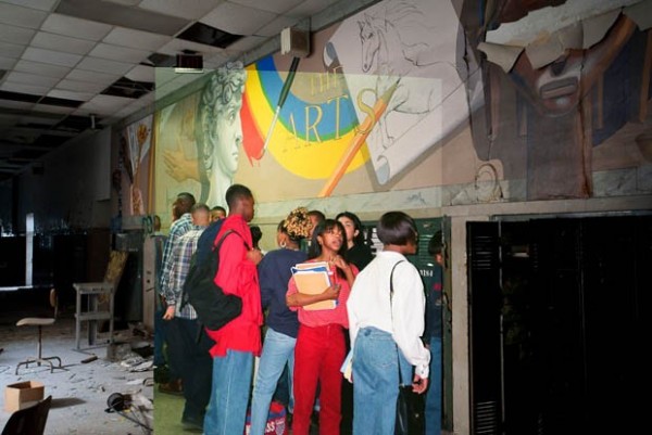 На сайте «Detroiturbex» есть замечательная серия фотографий Детройта о средней школе «Cass Tech High», которая называется «Then and now» – тогда и сейчас. На фотографии, где школа запечатлена в настоящий момент, наложены фотографии из прошлого – времен расцвета Детройта.