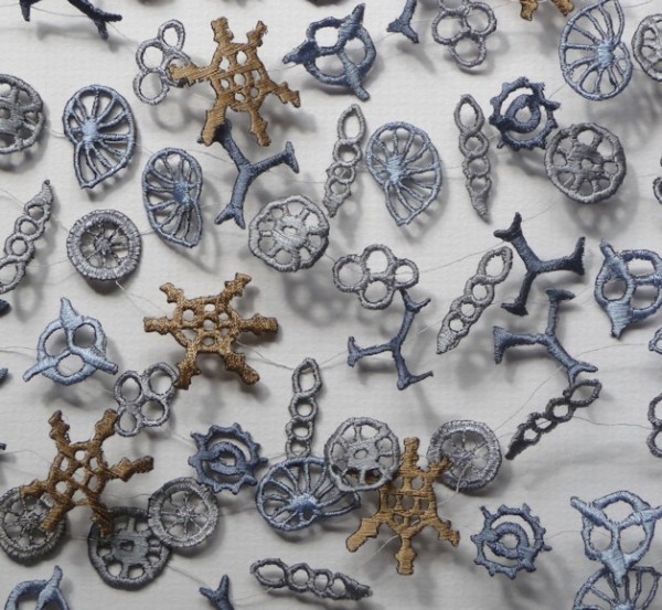 Это действительно интересная технология, позволяющая создавать необычные вышивки, при которой используется водорастворимая основа. Пока создаётся вышивка, основа присутствует и видна мастеру. Но затем она буквально исчезает – растворяется, оставляя нитяные дорожки, словно застывшие в воздухе по мановению волшебной палочки. Из этих разноцветных нитяных строчек образуются простые и приятные глазу формы и фактуры, отражая основные художественные концепции автора.
