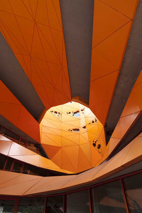 Лаконичность форм внутренней части строения оживлена снаружи металлическим фасадом, окрашенным в сочный апельсиновый цвет.