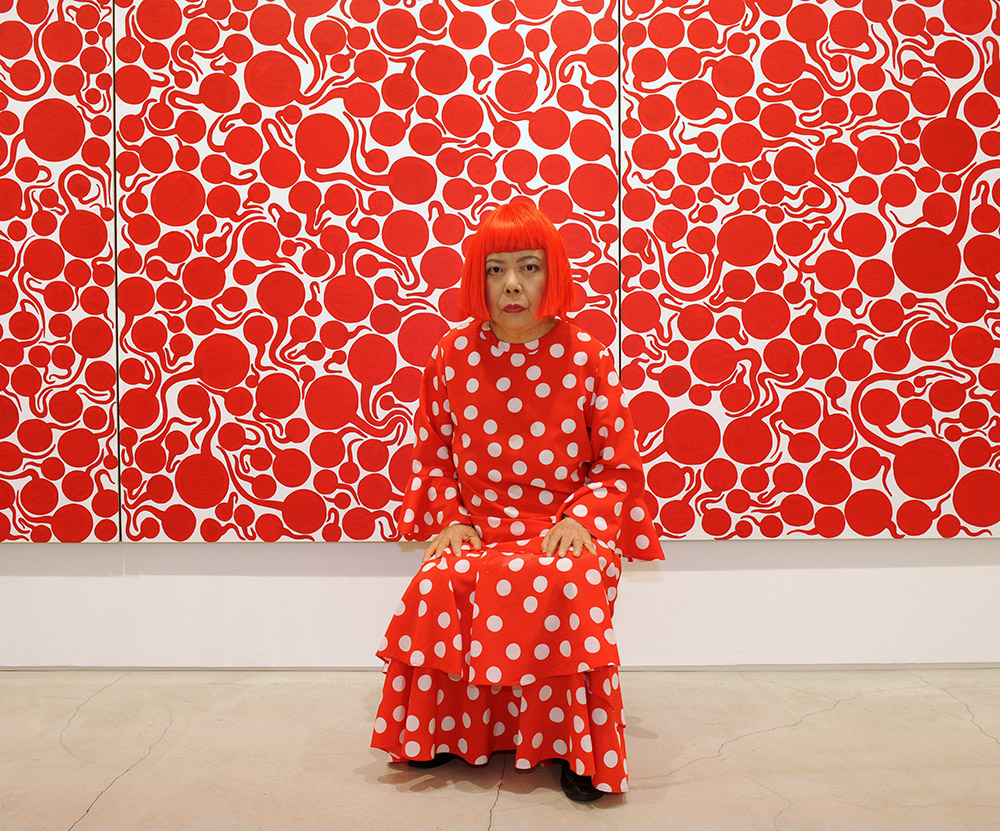 86-летняя Яёи Кусама — самая известная современная японская художница. Она с юности страдала от навязчивых состояний, и избавиться от них, по ее собственным словам, ей помогло искусство. Рисунок в горошек стал ее фирменным знаком, потом прибавилось увлечение зеркалами, тканями, тотальной инсталляцией. Успеха ее выставкам придает тот факт, что Кусама сегодня — полноправный персонаж популярной культуры, а не просто современная художница, живущая в своем замкнутом мире. Ее скульптуру даже установили в Музее восковых фигур мадам Тюссо в Гонконге. Там создали копию ее инсталляции, в которой можно сфотографироваться с восковой копией самой Кусамы.